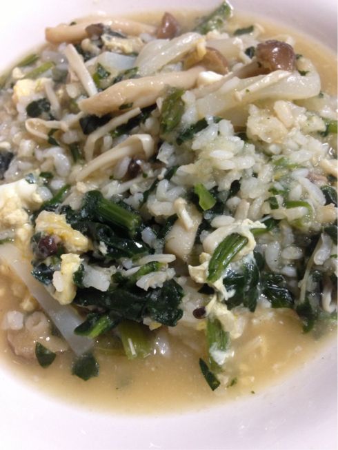 きのこ類、ほうれん草、こんにゃく、卵、大根おろしの雑炊。