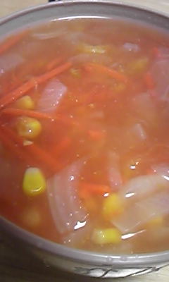 コーン、トマト一個、ニンニク少し、粉末コンソメ。