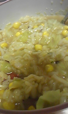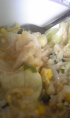 コーン、ご飯、レタス、卵、ソーセージを入れたもの。